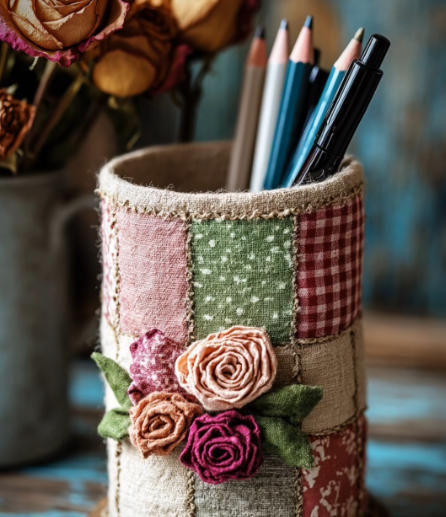 制作步驟: 將一次性紙杯徹底清洗干凈,晾干水分,這一步可以確保后續(xù)制作的衛(wèi)生和牢固性。 用剪刀將紙杯剪成你喜歡的形狀,比如波浪邊、鋸齒邊等,增加花籃的獨特性。 開啟熱熔膠槍(若使用白乳膠,可用小刷子涂抹),將麻繩的一端粘在紙杯底部邊緣,然后一圈一圈緊密地纏繞在紙杯外面,每纏繞一圈都要確保麻繩與紙杯充分粘合,讓花籃更加堅固耐用。 當(dāng)麻繩纏繞到合適高度后,用剪刀剪斷麻繩,并用熱熔膠固定末端。 若想要讓花籃更加美觀,可以用熱熔膠將蕾絲絲帶粘貼在麻繩表面,或者在花籃邊緣粘貼一些小裝飾,如彩色珠子、亮片等,讓它成為家中獨特的裝飾品 。 完成后的編織花籃可以放在客廳收納遙控器、小零食袋;放在臥室收納頭繩、發(fā)夾等小飾品;放在書房收納便簽紙、回形針等文具 。它不僅能有效收納雜物,還能為家居環(huán)境增添一份自然、溫馨的氛圍 。 (二)布藝筆筒 / 化妝刷桶